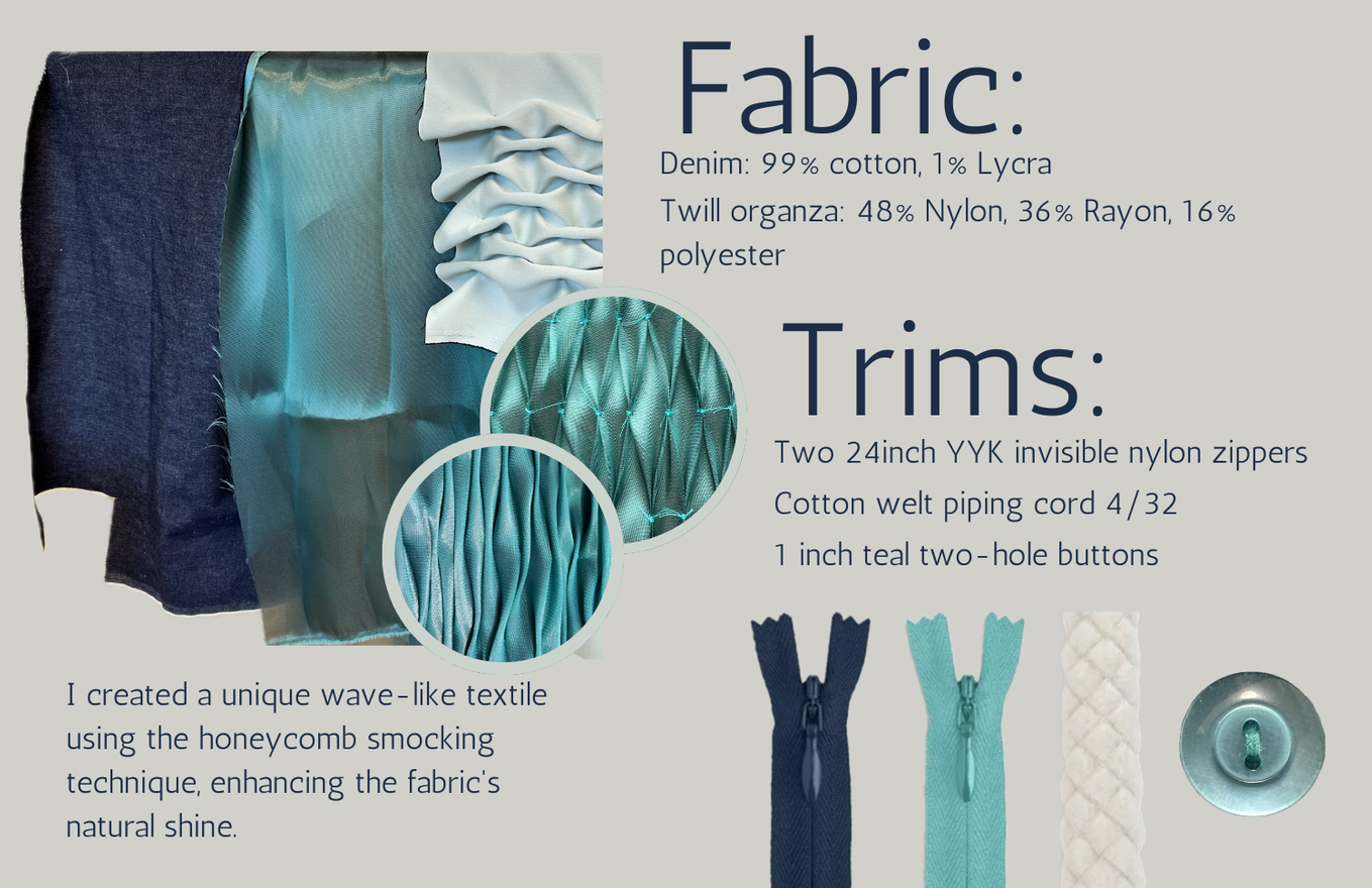 Indigo Elegance is a women's ready-to-wear collection which draws inspiration from the joy I experienced upon finding my grandma’s 1950s prom dresses. As it is what sparked my love for fashion, I embraced the concept of volume from that era while also adding a modern twist by using denim as the primary fabric. The smocked twill organza pieces add vibrant color and texture to the look.